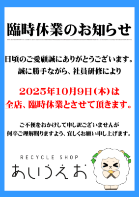 2025.10.01 あいうえお全店 臨時休業のお知らせ 2025年10月9日(木)は、上記により 全店臨時休業とさせて頂きます。 なお、10月10日(金)からは、通常通り営業させて頂きます。 ご不便をおかけして申し訳ございませんが 何卒ご理解賜りますよう、宜しくお願い申し上げます。 リサイクルショップ あいうえお