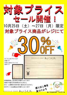 2025.10.25 札内店 柏林台店 西21条店 10月25日~27日 対象プライス30%OFFセール 札内店・柏林台店・西21条店にて「10月25日~27日」の3日間に対象割引セールを開催中です。 今週の対象セールはこちらです。 家具や衣類に活用していることが多いこちらのプライスが対象!