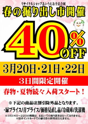 3月20日~22日期間限定。春の掘り出し市開催いたします。