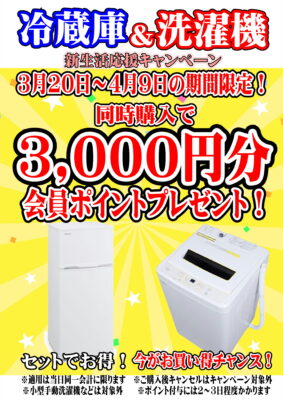 2026.03.19 全店 冷蔵庫・洗濯機同時購入キャンペーン 3月20日から4月9日までの期間中、 冷蔵庫と洗濯機を同時にご購入いただくと、 なんと!3,000円分の会員ポイントをプレゼント! 新生活の準備や、お買い替えをお考えの方は、 とってもお得なチャンスです!