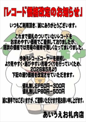 2026.04.26 札内店 札内店EP/LPレコード価格改定のお知らせ 2026年5月より以下の内容で料金の変更がございます。お客様には大変ご迷惑をお掛けいたしますがご理解の程よろしくお願いいたします。